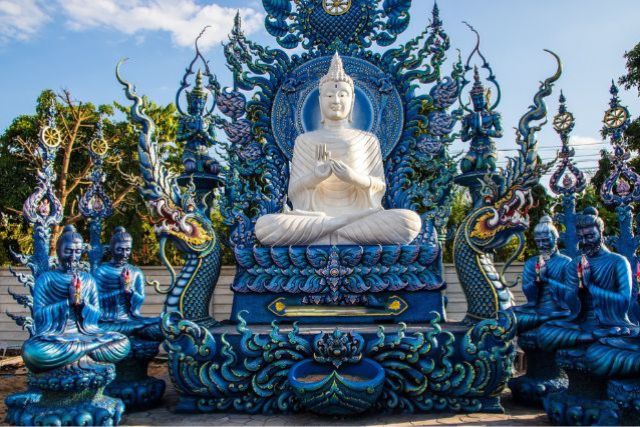 Visita al Wat Rong Suea Ten (o Templo Azul) un novedoso y llamativo templo construido por el arquitecto local que participó en la construcción del Templo Blanco. Llama la atencion por si llamativo color, las grandes estatuas custodiando la entrada, sus mosaicos y un gran Buda blanco.