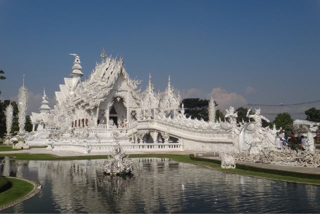 Parada en el espectacular y contemporáneo Wat Rong Khun, donde el color blanco significa la pureza y el cristal significa la sabiduría de Buda como la "luz que brilla en el mundo y el universo". Los aldeanos piensan que Buda cruzó el puente del templo para predicar el dogma por primera vez.